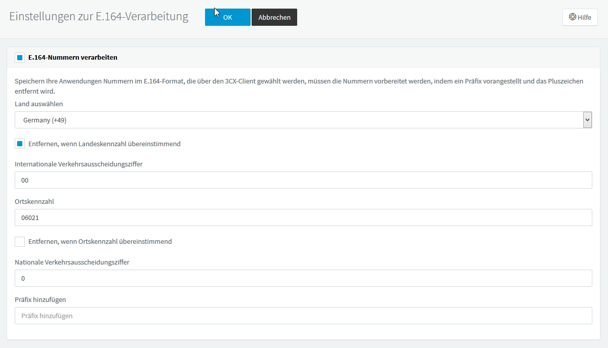 - “Entfernen, wenn Ortskennzahl übereinstimmend” deaktiviert und “Präfix hinzufügen” leer lassen.