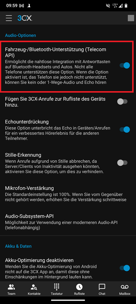 Abhilfe kann schaffen, in den Einstellungen der 3CX-App die “Telecom API” zu aktivieren: