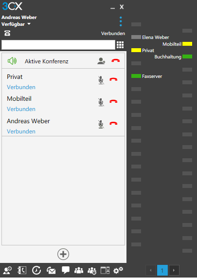 Im 3CX Phone während ein Gespräch geführt wird auf die Schaltfläche “Konferenz” klicken, den weiteren Konferenzteilnehmer anrufen, sobald dieser abnimmt befindet man sich bereits in der Konferenz.