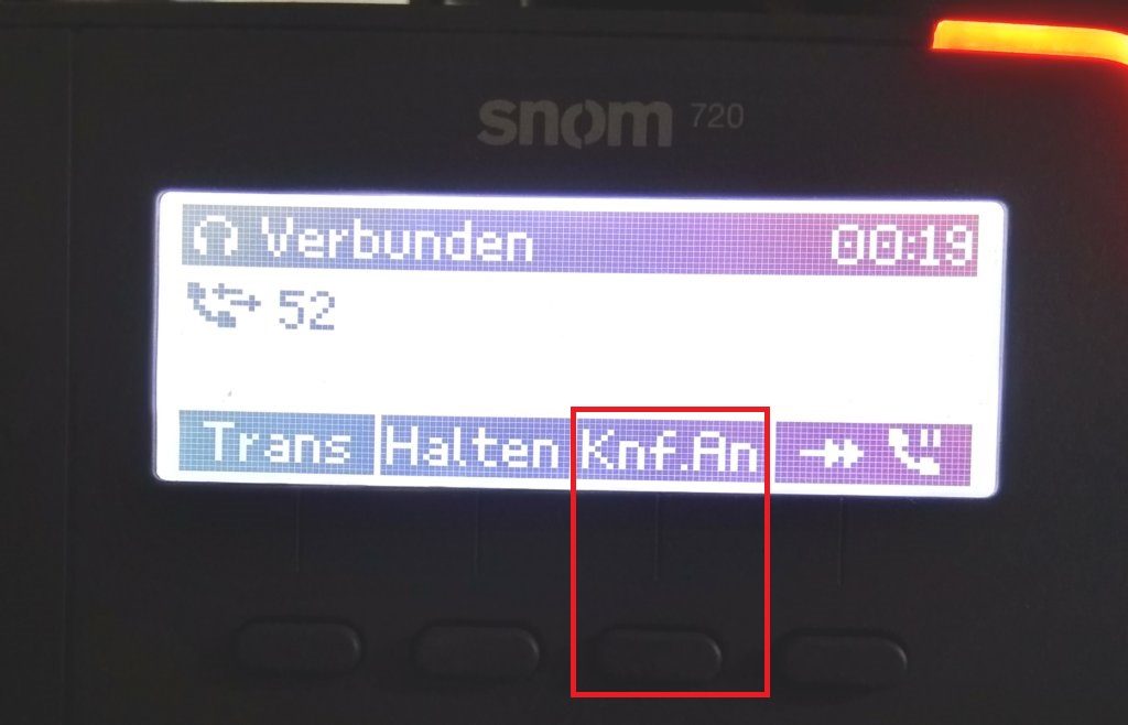 Während man bereits ein Gespräch führt auf “Line 2” (zweite BLF-Tase) drücken, den gewünschten Gesprächspartner anrufen, sobald dieser abnimmt den Softkey “Knf.An” (snom 720) bzw. “Konferenz” (snom 760) drücken.