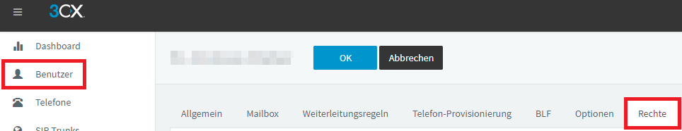 - Den gewünschten Benutzer bearbeiten und zum Reiter “Rechte” wechseln.