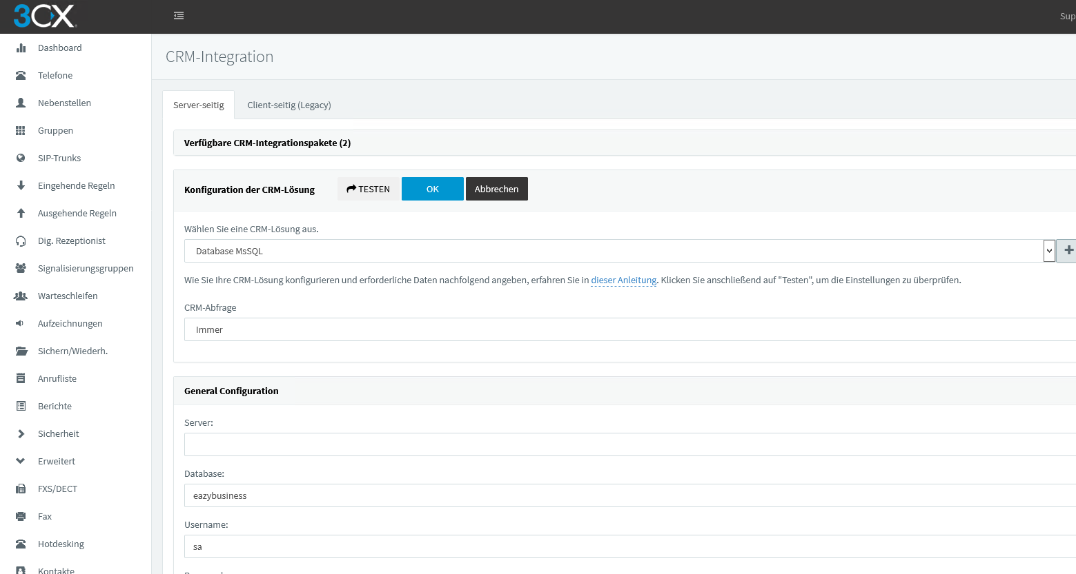 Seitens 3CX wird JTL-Wawi nicht nativ unterstützt, allerdings kann direkt der zugrundeliegende MS SQL-Server angesprochen werden. Zu diesem Zweck muss der Datenbankserver für die Telefonanlage erreichbar sein, d.h. gegebenenfalls Firewall und Port Server-seitig konfigurieren.