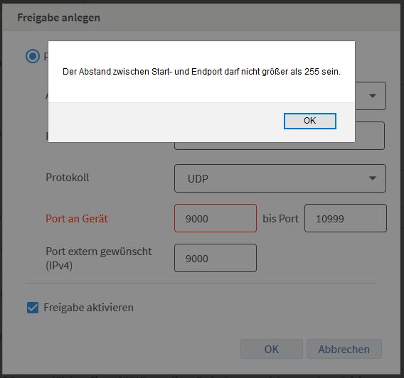 Bei vielen Routern und Firewall ist das kein Problem, bei der AVM FRITZ!Box im Speziellen stößt man auf eine Begrenzung der maximalen Länge der Port-Range. Dies betrifft die Freigabe von RTSP im Bereich 9000 bis 10999/udp:
