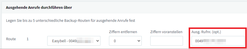 Unterstützt der SIP-Trunk CLIP no screening kann in der ausgehende Regel im Feld “Ausg. Rufnr. (opt.)” die gewünschte anzuzeigende Rufnummer eingetragen werden: