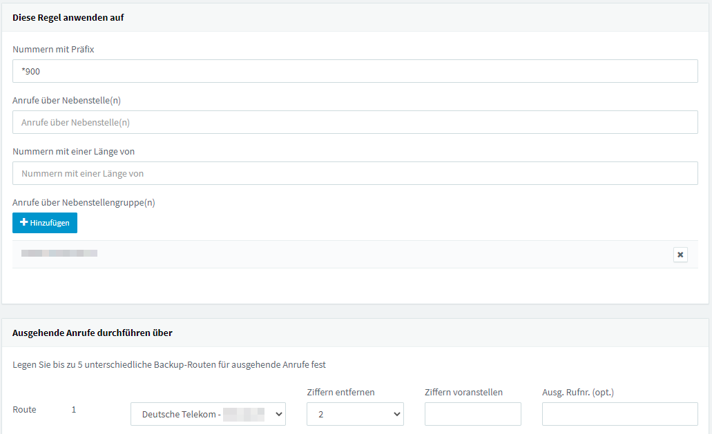 Mit Hilfe eines Präfixes kann man festlegen, das bei Bedarf ein bestimmter SIP-Trunk bzw. eine bestimmte ausgehende Rufnummer verwendet wird. Hierzu legt man ebenfalls eine ausgehende Regel an und definiert das gewünschte Präfix.
