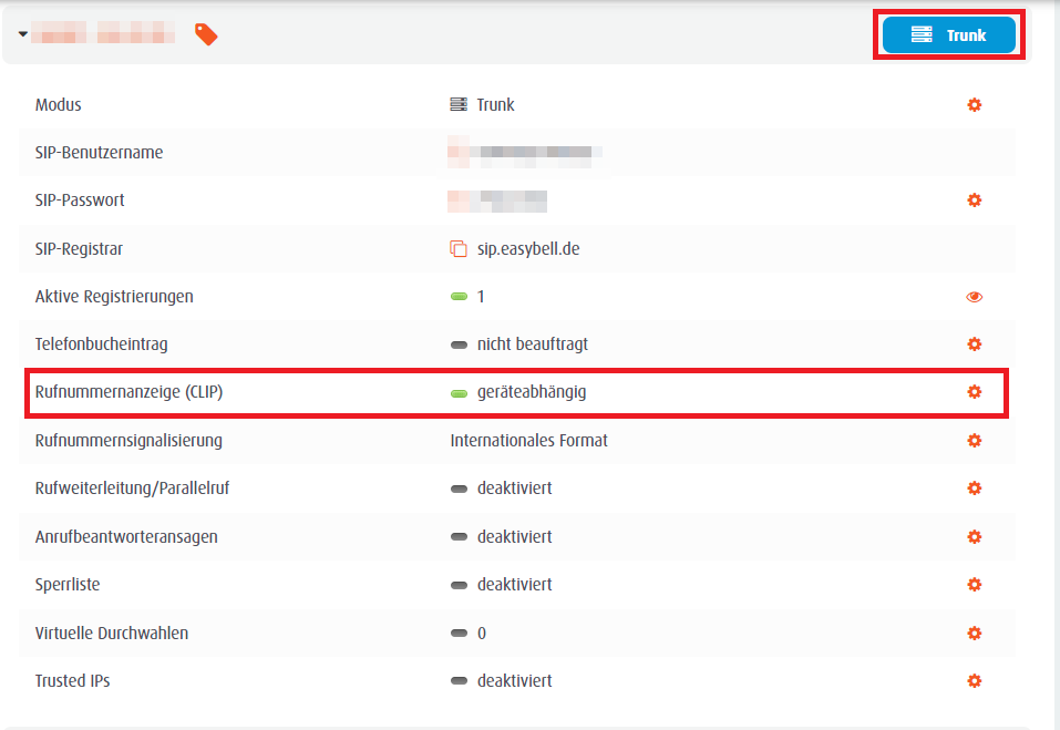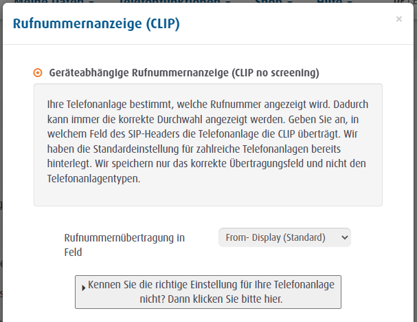 Die Rufnummer oder der Rufnummern-Block müssen als “Trunk” (und nicht als “Telefon” oder etwas anderes) konfiguriert sein, denn nur dann kann man unter “Rufnummernanzeige (CLIP)” die Auswahl “geräteabhängig” auswählen und konfigurieren.