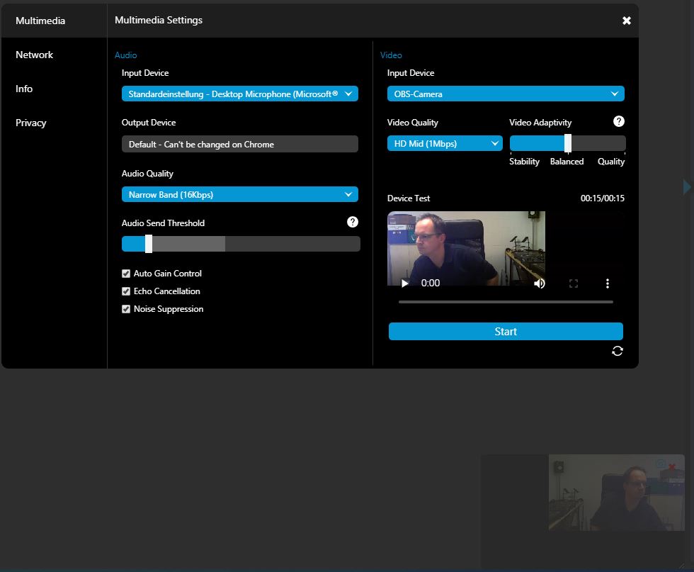 Davon sollte man sich nicht irritieren lassen und schon gar nicht in der Quelle das Bild drehen/spiegeln lassen. Beim “Device Test” ist die Ausrichtung ok, in der Anzeige des eigenes Bildes bei der eigentlichen Konferenz (rechts unten) ist sie gespiegelt.