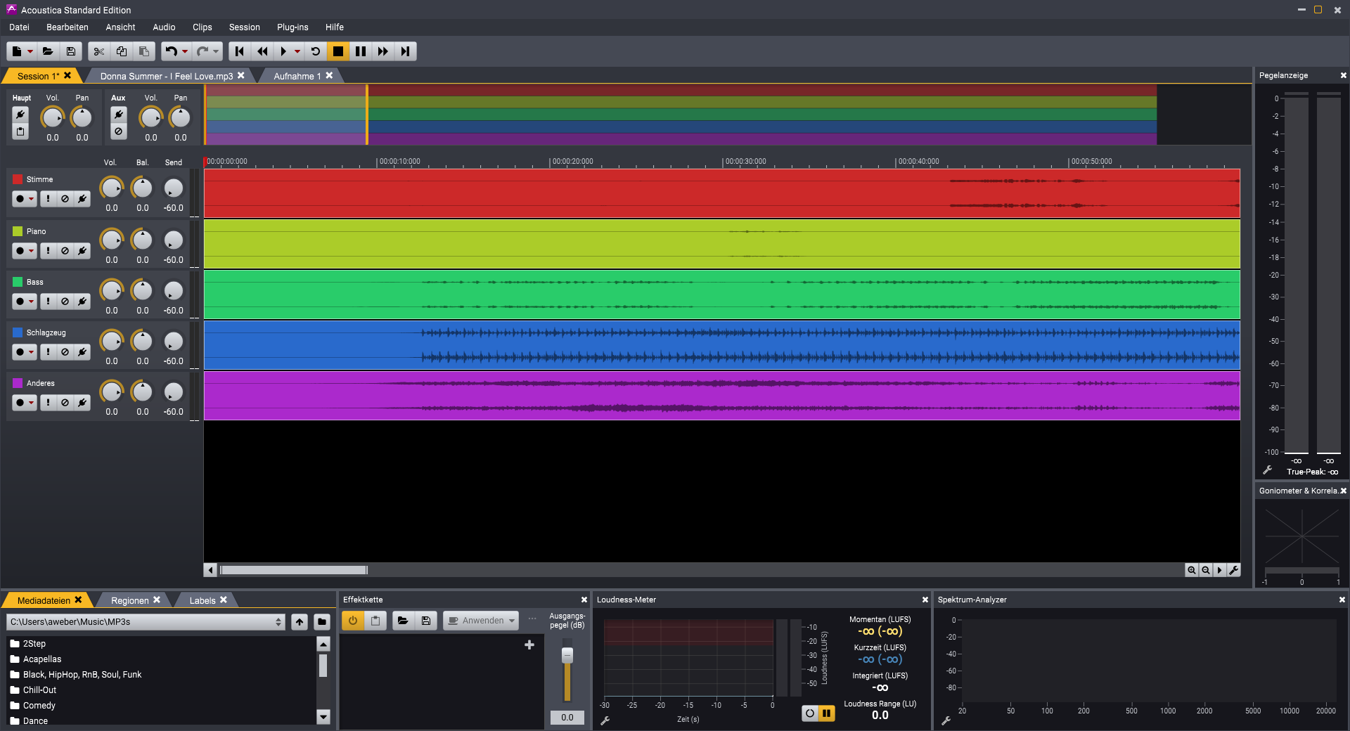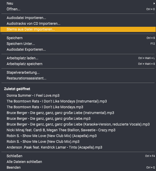 Um direkt beim Öffnen oder Laden eines Musikstücks die Stems erzeugen zu können, muss man über “Datei – Neu – Neue Mehrspur-Session…” erst eine entsprechende Sitzung erzeugen. Anschließen kann man über “Datei – Stems aus Datei importieren…” ein Musikstück auswählen, das dann sofort entsprechend aufbereitet wird.