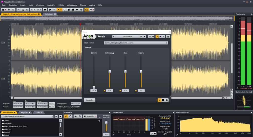 Von Acon Digital gibt es mit Acoustica ab Version 7 ebenfalls ein Werkzeug um Stems erzeugen zu können. Dort wird die Funktion “Remix” genannt und ist bereits in der kleinsten Ausgabe der Anwendung enthalten. Selbstverständlich kann Acoustica noch viel mehr als nur Stems, ein genauerer Blick lohnt sich.