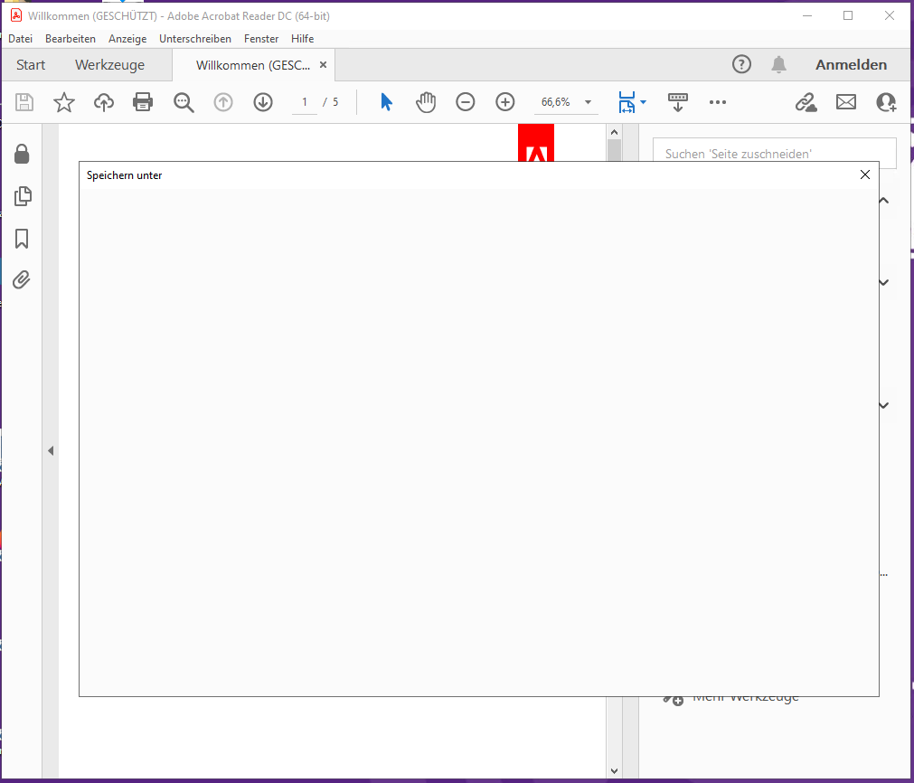 Möchte man aus dem Adobe Acrobat Reader DC heraus eine PDF-Datei mittels “Speichern unter” an einem anderen Ort oder mit anderem Namen ablegen, kann es vorkommen das man lediglich ein leeres weißes oder graues Fenster erhält.