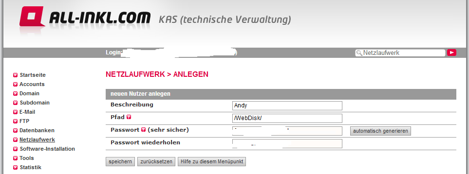 Als nächstes wird ebenfalls im KAS unter “Netzlaufwerk” ein neuer Benutzer angelegt. Man vergibt ein Kommentar (beispielsweise den Namen des Anwenders), wählt den Pfad aus und generiert ein Kennwort.