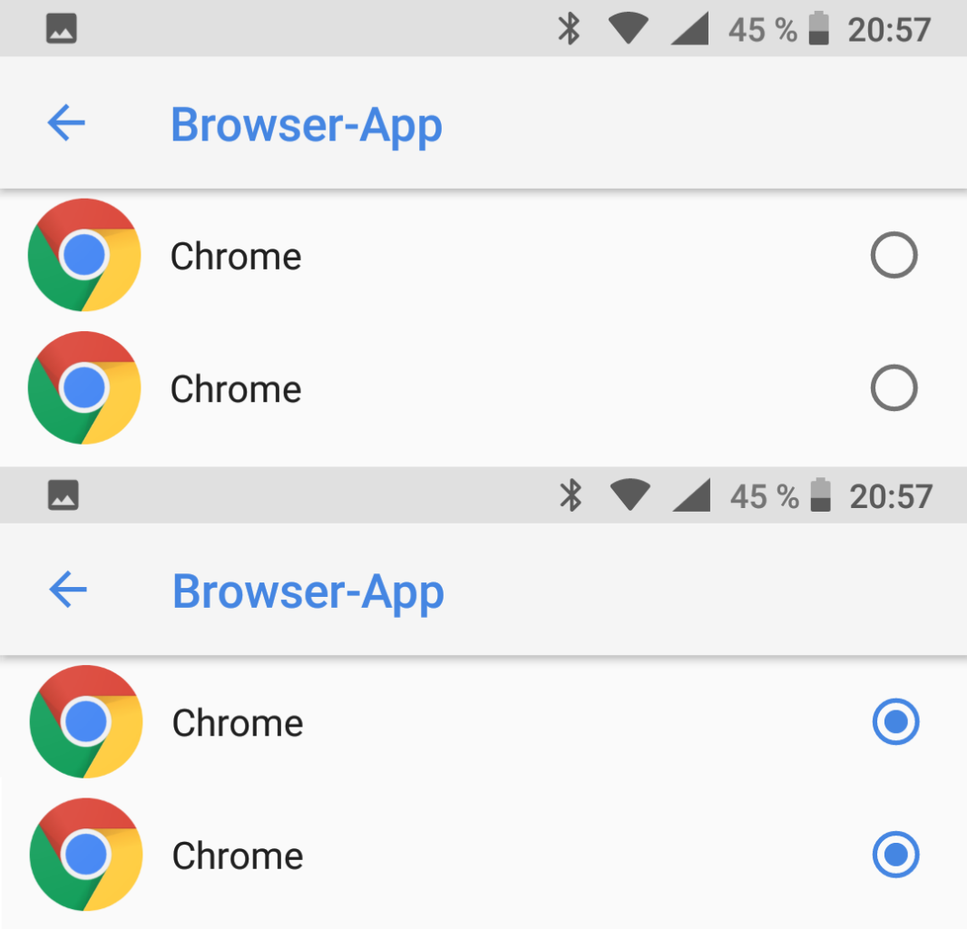Tipp man nun “Browser-App” an, erhält man gleich zwei Chrome-Einträge zur Auswahl. Ganz gleich welchen man auswählt, es werden beide aktiviert, helfen tut dies allerdings nicht, die Probleme bleiben bestehen.