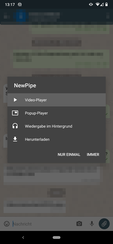 An dieser Stelle kann man “Nur diesmal” oder “Immer” festlegen. Daraufhin wird seitens NewPipe gefragt, was man genau tun möchte: