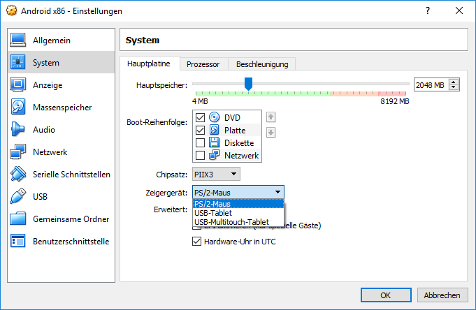 Installiert man Android-x86 unter VirtualBox mit den Vorgaben der angelegten virtuellen Maschinen, z.B. aus Basis der Linux-Vorlage, so funktioniert die Maus nicht.
