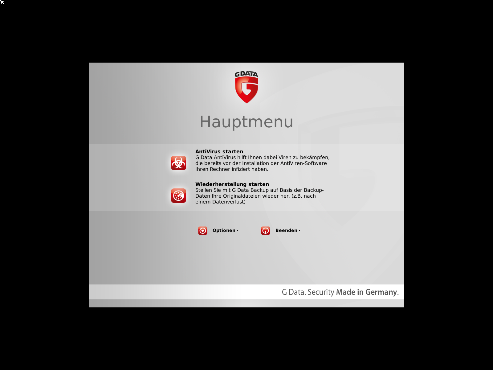 Mit dem G Data Bootmedium steht ebenfalls von einem deutschen Anbieter eine Startumgebung zur Verfügung. Das Medium an sich kann von jedem frei heruntergeladen werden. Ein Update der Virensignaturen ist allerdings nur mit laufenden Abo (Zugangsdaten erforderlich) möglich. Wie bei Kaspersky muss das Starten von CD angegeben werden. Per Vorauswahl ist das installierte Betriebssystem angegeben. Das Bootmedium ist darüber hinaus in der Lage, Backups die mit G Data TotalProtection erstellt wurden wiederherzustellen.
