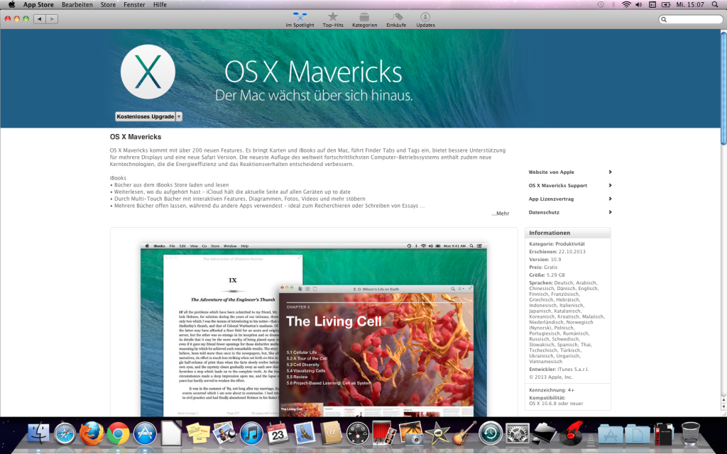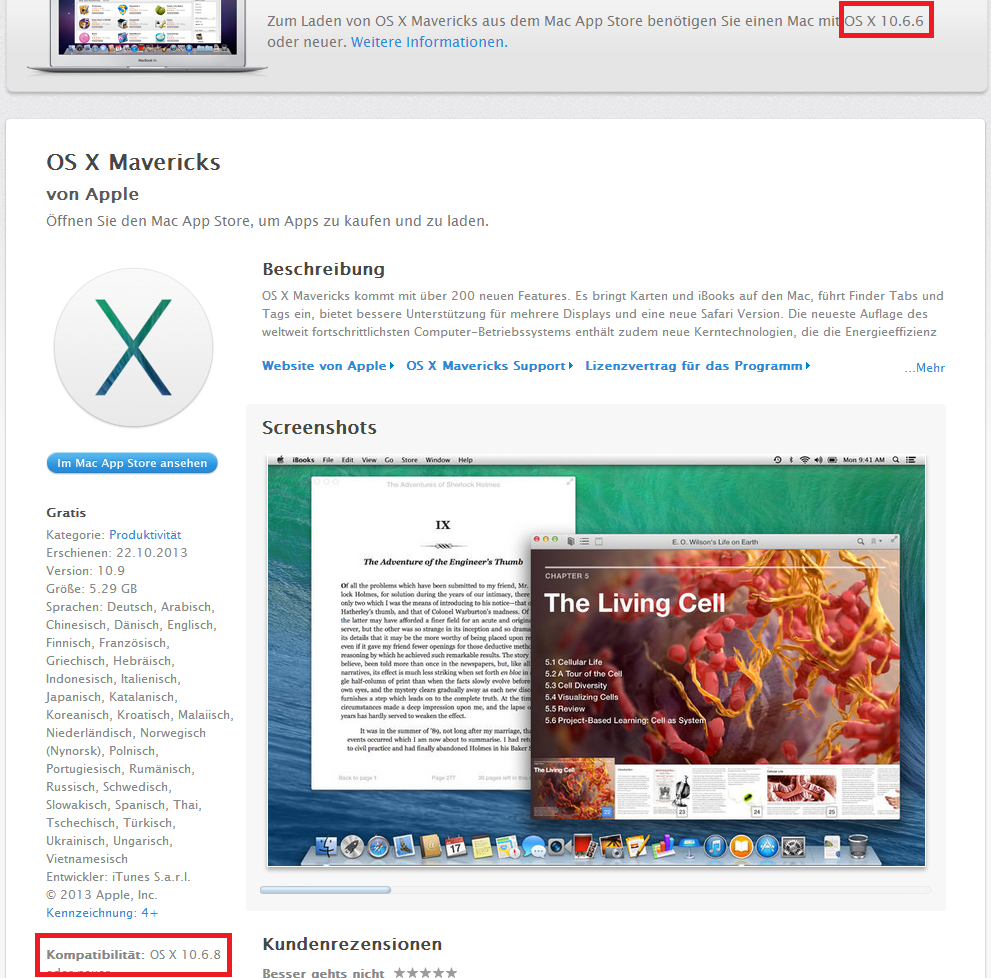 Jedenfalls kann man OS X Mavericks via iTunes herunterladen. Leicht verwirrend ist allerdings die wiedersprüchliche Angabe von welcher OS X-Version aus installiert werden kann: