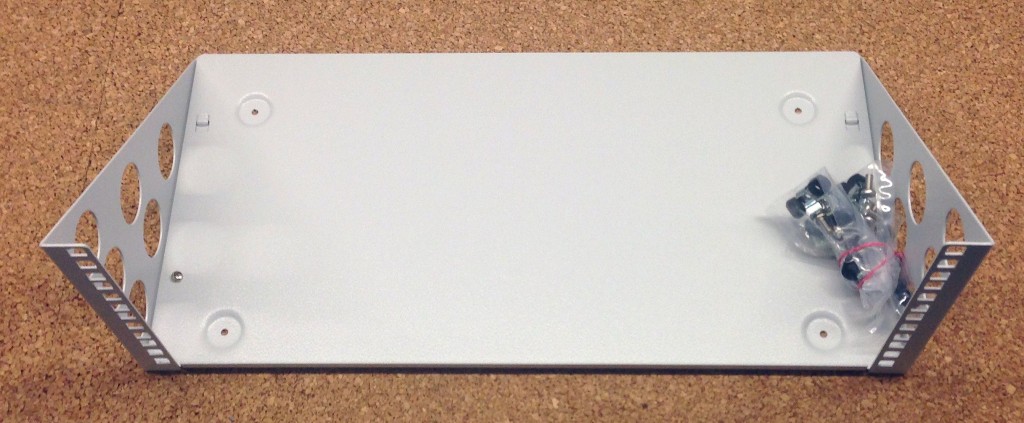 Nach ein wenig Suchen sind wir dann im Katalog von secomp über das 19″ Tischrack von apraNET gestoßen. Das war genau das, das wir gesucht hatten. Mit 4HE bzw. 4U (auf deutsch Höheneinheiten) bietet es genug Platz für die genannte Montage.
