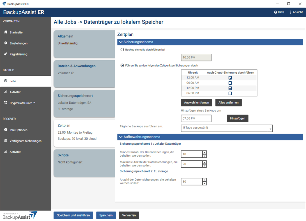- Mehrere Sicherungsläufe pro Job und Tag: Bislang konnte nur ein Zeitpunkt für eine Sicherung festgelegt werden. Wollte man den Job mehrmals am Tag ausführen musste dies via CLI erfolgen. Ab Version 1.3.0 kann direkt in der Job-Konfiguration angegeben werden, das dieser mehrfach ausgeführt werden soll und es kann zudem differenziert werden, ob nur lokal oder auch in die Cloud zum jeweiligen Zeitpunkt gesichert wird: