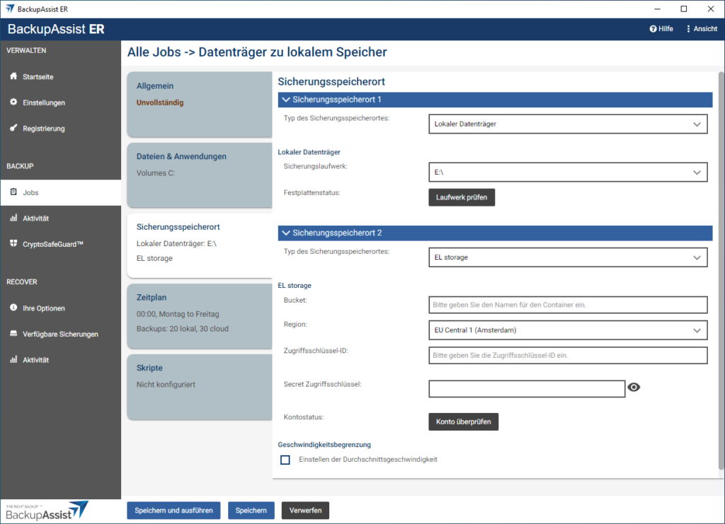 Bestehende “Von Datenträger zu Datenträger und in die Cloud”-Jobs können einfach bearbeitet werden, um z.B. EL storage nun direkt als Ziel angeben zu können, allerdings müssen die Angaben zu Bucket(name), Zugriffsschlüssel-ID und Secret-Zugriffsschlüssel neu eingetragen werden. Bestehende Buckets bzw. deren Inhalt aus “S3-kompatible Cloud-Sicherung” werden erkannt, es erfolgt also kein neues Cloud-Backup.