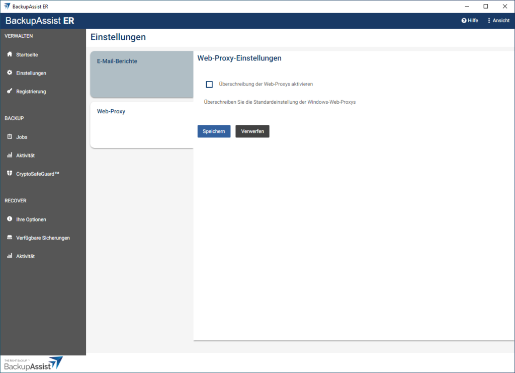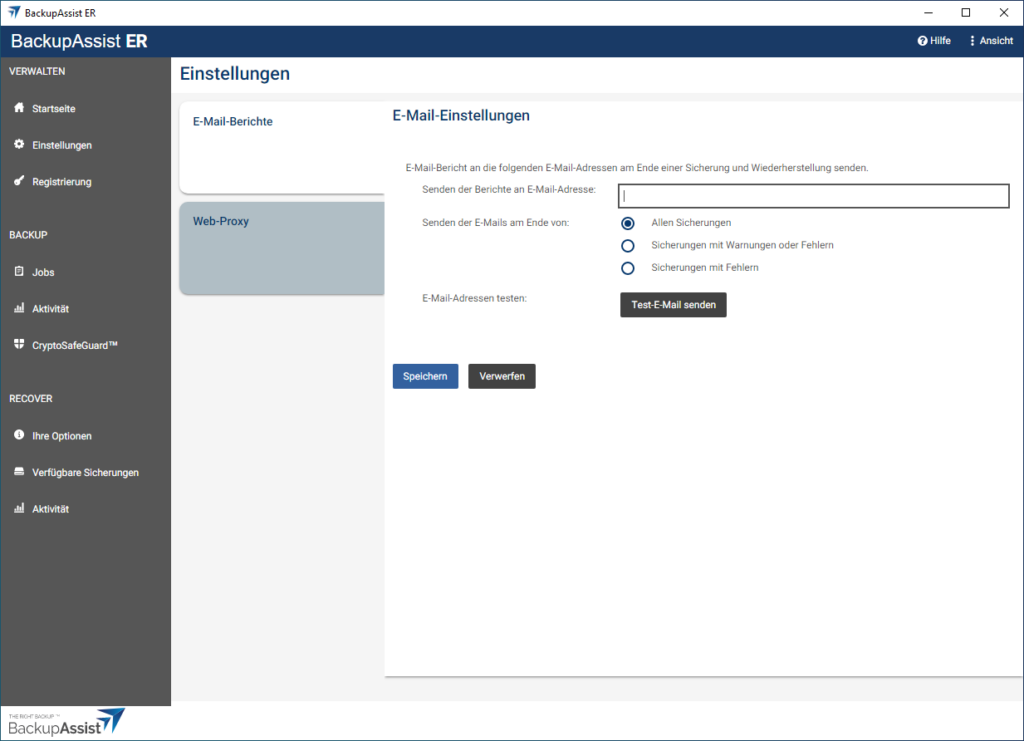 - Es können nun jenseits der Managed Backup Console (MBC) direkt in BackupAssist ER E-Mail-Berichte konfiguriert werden: