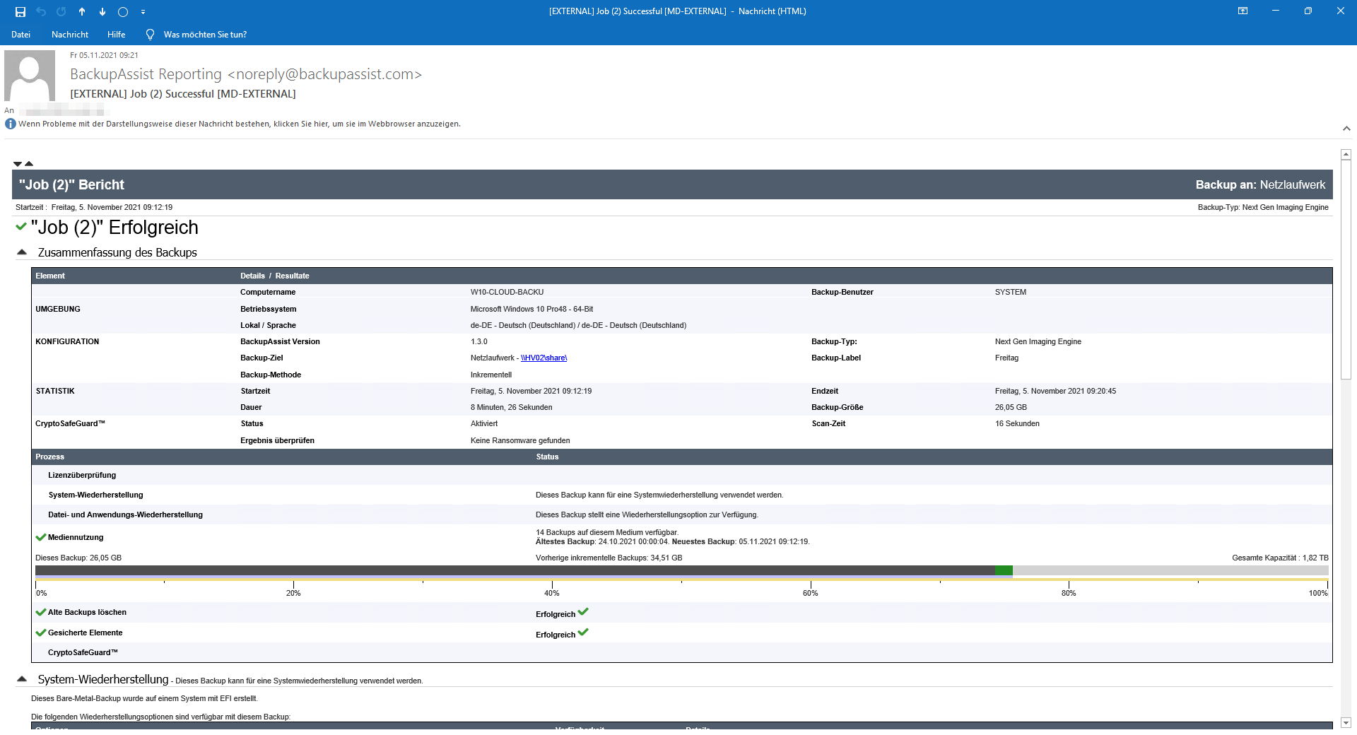 Zu den E-Mail-Berichten sei erwähnt das man keinen eigenen SMTP- oder Mail-Server konfigurieren kann. Die Berichte erhält man von der Absender-Adresse “BackupAssist Reporting <noreply@backupassist.com>”. Es kann eine Test-Nachricht versendet werden. Leider lässt sich in den Berichten nicht erkennen, von welchem Kunden-System diese stammen, Host- bzw. Computernamen sind nicht unbedingt eindeutig. Dies ist leider eher ungünstig, wenn die Berichte an die Support- oder Helpdesk-Adresse des betreuenden System-Hauses gehen. Im Fehlerfall kann man sich dadurch behelfen, das man in der MBC bzw. deren Bericht nachschaut, welches System Aufmerksamkeit erfordert.