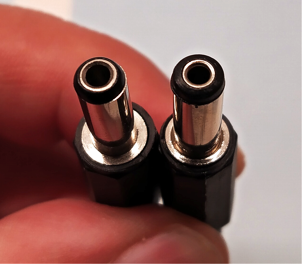 Die 5.5 mm Hohlstecker gibt es mit zwei verschiedenen Innendurchmessern: 2.1 (rechts) und 2.5 (links) mm: