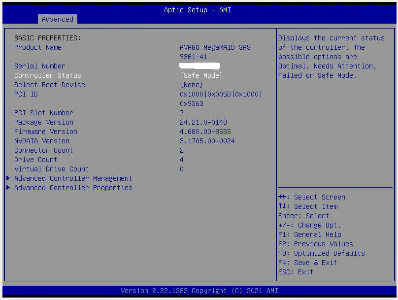 An einem Mittwoch-Abend stürzte unvermittelt das System ab und bootete anschließend nur noch in die EFI-Shell. Ein Blick ins BIOS zeigte, das der RAID-Verbund nicht mehr als Boot-Medium zur Verfügung stand. Ein weiterer Blick, diesmal in den RAID-Controller, offenbarte das dieser sich im Safe Mode befindet. Verbaut ist übrigens ein Broadcom (Avago/LSI) MegaRaid 9361-4i.