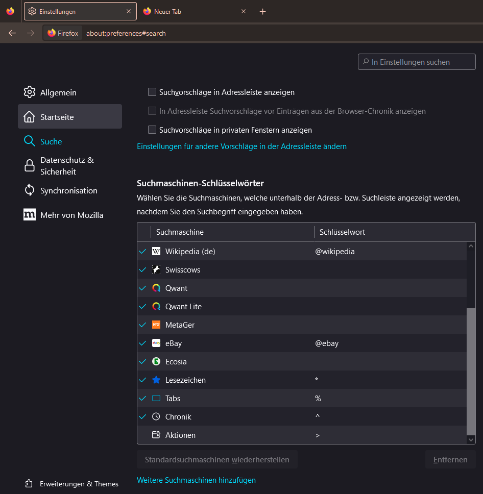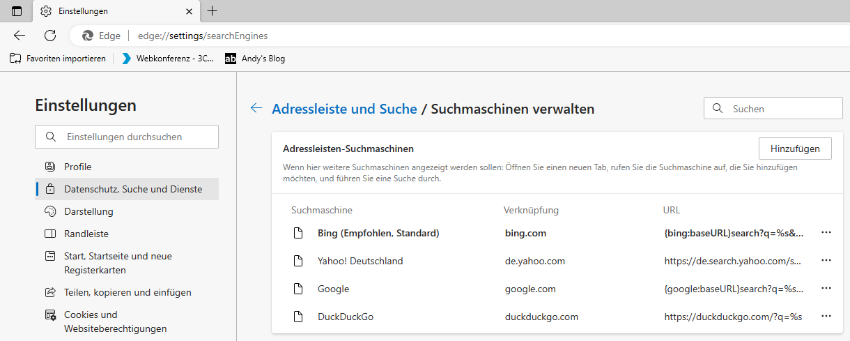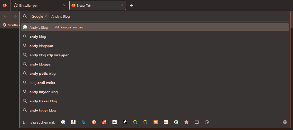 Ähnlich verhält es sich in anderen Browser, außer das dort die “Verknüpfung” oder das Schlüsselwort bzw. Kürzel anders ist. Diese können im übrigen in jedem Browser auf die eigenen Bedürfnisse angepasst werden.