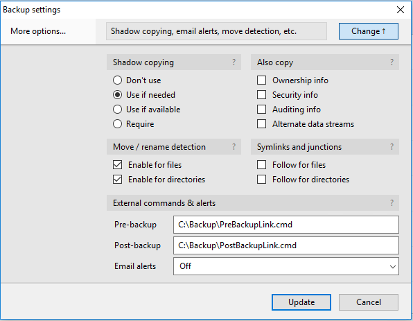 Die nachfolgenden Skripte liegen unter “C:\Backup” und müssen den eigenen Bedürfnissen angepasst werden. Ferner muss bei der Verwendung von “mklink” und “net use” im Backup-Job unter “detecting changes” “Re-scan destination on every run” aktiviert sein: