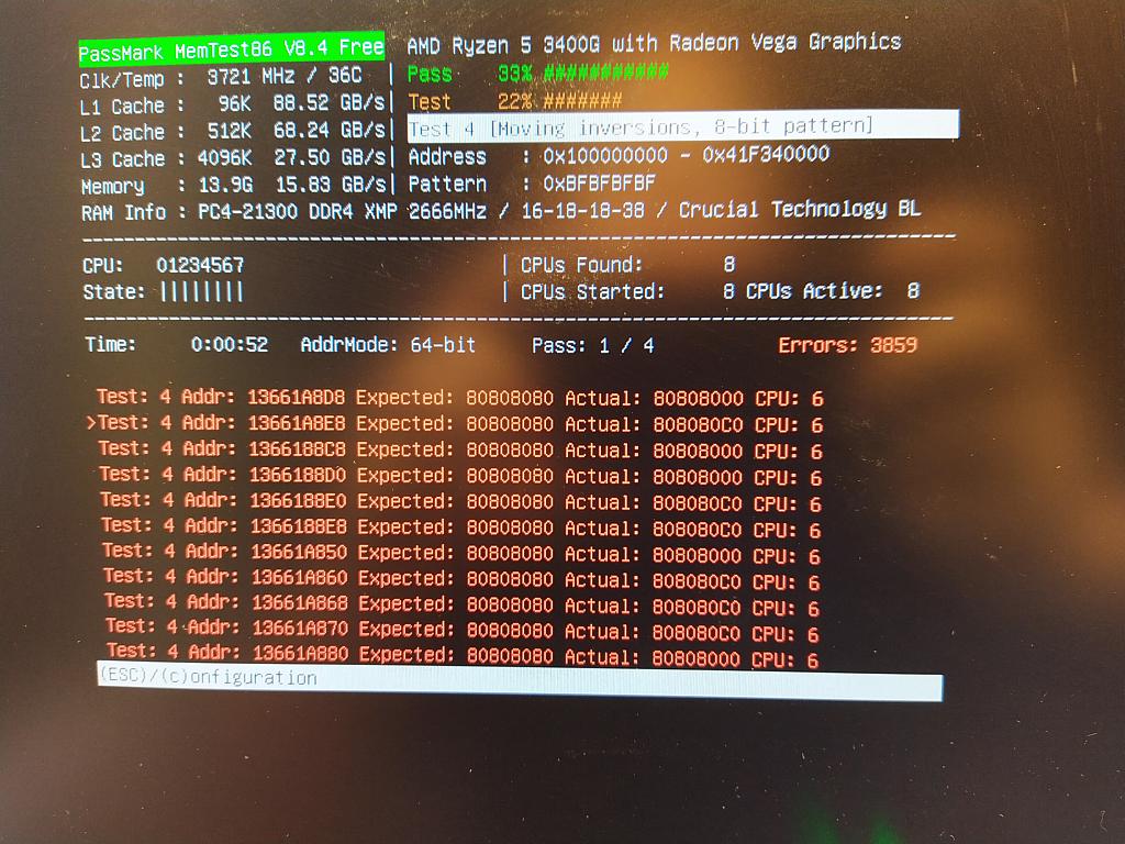 Zwischenzeitlich war’s auch so, das meine USB-Boot-Sticks nicht mehr erkannt wurden. Warum ein Problem, wenn man mehrere haben kann. Die BIOS-Defaultwerte wurden ebenfalls mal geladen, auch das half nichts. Nach diesem Hin und Her dann der Verdacht es könnte am Arbeitsspeicher liegen, immerhin sind 16 GB (2x 8 GB) verbaut. Also mal die aktuelle Version von Memtest86 heruntergeladen und auf einen mit Ventoy präparierten Stick gepackt sowie gestartet. Quasi sofort ab Teststart dann das: