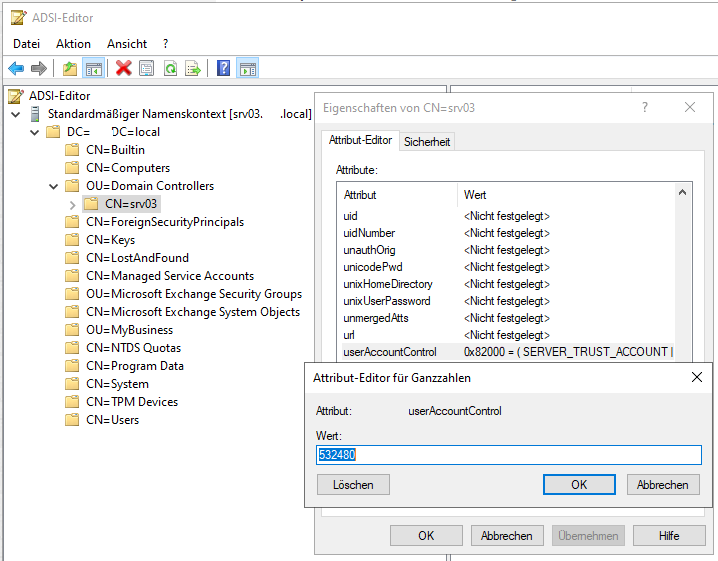 - Die Eigenschaften des betroffenen Domänencontrollers öffnen und das Attribut “userAccountControl” bearbeiten. Nun den Standard-Wert “532480” (DEZ, entspricht 0x82000 HEX) eintragen.