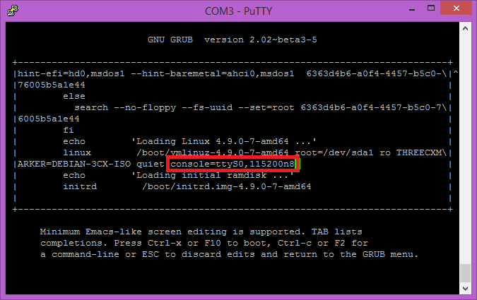 - Den “linux”-Eintrag um “console=ttyS0,115200n8″ ergänzen” und “F10” drücken.