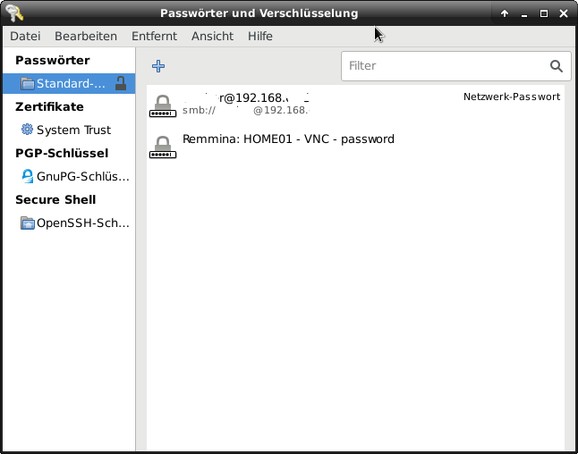 Auf den Schlüsselbund (gnome-keyring) greifen z.B. Remmina & Thunar, sofern die Zugangsdaten zu anderen Systemen bzw. Freigaben gespeichert wurden, zurück.