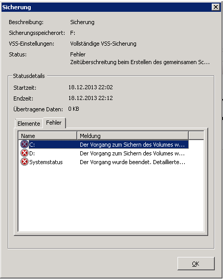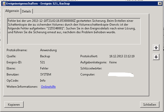 Bei einem Kunden eines Partners brach die Windows Server-Sicherung mit der Meldung “Zeitüberschreitung…” ab. Im Ereignisprotokoll findet sich ein Eintrag mit der ID 521 und darin dem Fehlercode “2155348001”. Bei dem betroffenen System handelt es sich um einen Windows Small Business Server 2011 Standard. Der Fehler kann allerdings auch bei den anderen Windows Server-Editionen auftreten.