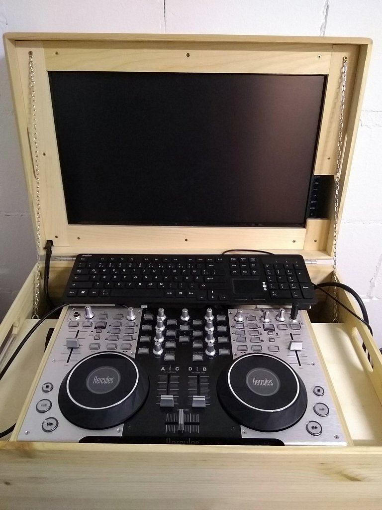 Das ganze Ding besteht aus zwei Holzboxen und einem Deckel die ich bei eBay geholt hatte und dann passend gemacht habe. Verbaut ist ein übrig gebliebenes Wortmann Terra-Display, ein HP T610 ThinClient (als DJ-PC), eine USB-Tastatur mit integrietem Touchpad von Perixx und eine Hercules DJ Console 4-mx.