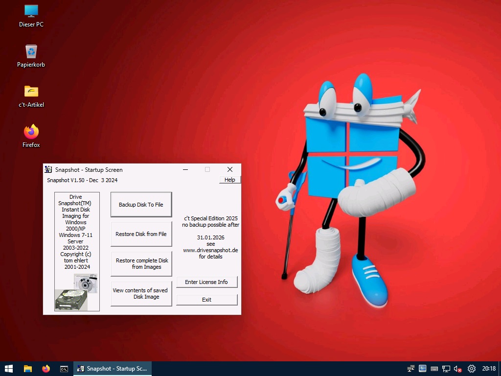 Alle Jahre wieder gibt es eine aktualisierte Ausgabe des c’t-Notfall-Windows, wie gehabt mit einer Jahreslizenz von Drive Snapshot (Lauffähig bis 31.01.2026).
