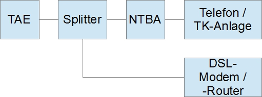 Die klassische Verkabelung und Geräte-Konstellation für DSL- und ISDN-Anschlüsse sieht wie folgt aus: