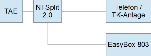 Bei einem Interessenten fand ich nun eine ähnliche Situation vor. In diesem Fall befindet sich vor einer Vodafone EasyBox 803 eine Arcor Starterbox DSL. Die Starterbox enthält bereits einen Splitter, NTBA und sogar einen a/b-Wandler. Im Vodafone EasyBox 803 Handbuch auf Seite 28 im Abschnitt 2.3 bei Punkt 2 heißt es: