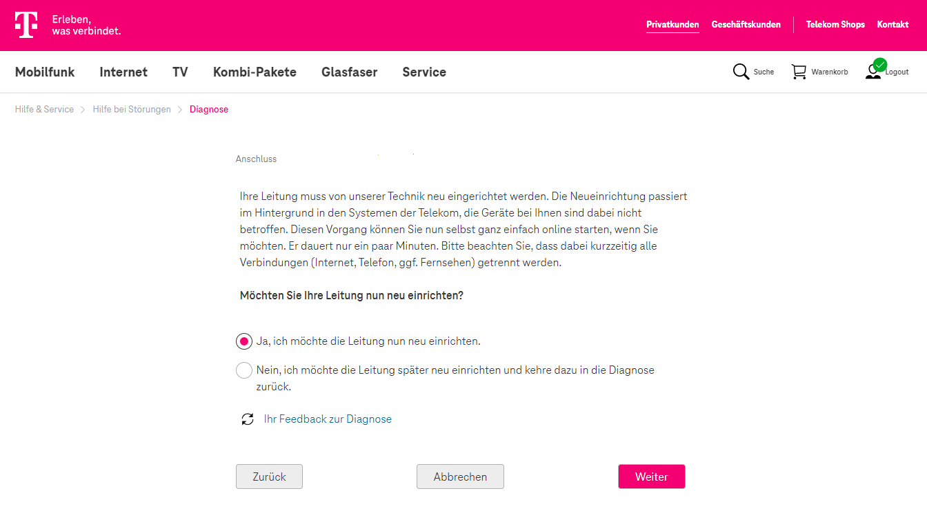 Der Verdacht war naheliegend, das der Kunde von einer Telekom-Störung betroffen ist. Hinzu kam die Info, das bei einer nahegelegenden anderen Firma ebenfalls nichts mehr ging. Daraufhin im Kundencenter eine Diagnose gestartet und folgende Meldung erhalten: