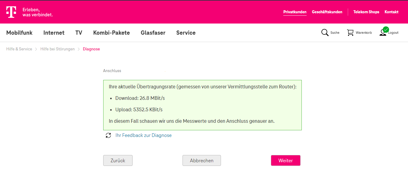 Da der zuvor bei der Störungsmeldung gewünschte Rückruf selbst Stunden später nicht erfolgt war wieder im Kundencenter geschaut, wie der aktuelle Stand ist. Eine Störungsmeldung ist allerdings nicht vorhanden, lediglich eine angeblich abgebrochene Diagnose die man weiterführen oder neu beginnen kann. Letzteres gemacht, da man ja seit Stunden wieder online ist. Mit der Angabe das mit der Geschwindigkeit etwas nicht stimmt dann folgendes Messergebnis bekommen: