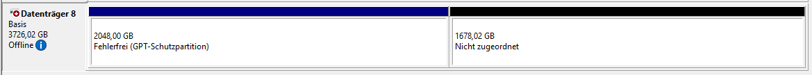 Nachdem die Festplatte intern via SATA angeschlossen war zeigte die Datenträgerverwaltung von Windows, das es nicht mehr eine große Partition, die sich über die gesamte Kapazität erstreckt, sondern eine 2 TB große “GPT-Schutzpartition”: