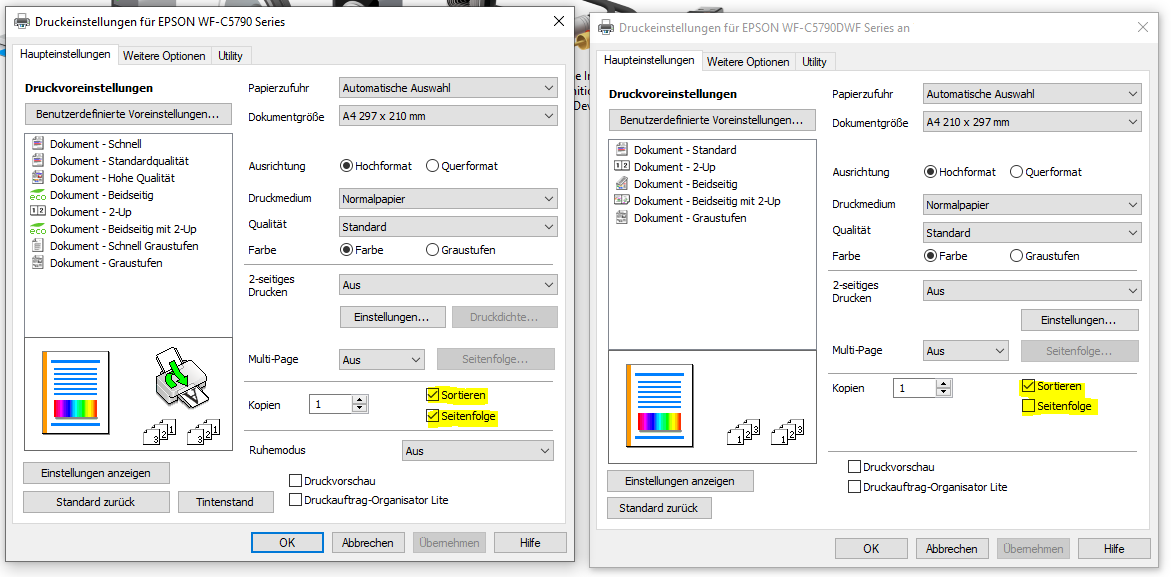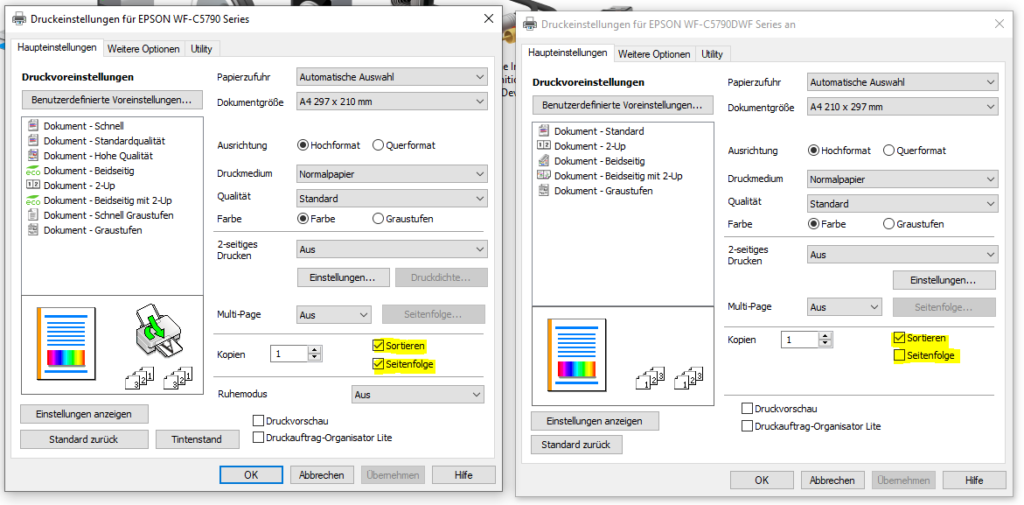 Links die Einstellungen des Drucker-Treibers, rechts die des Universal-Treibers, in diesem Fall noch zusätzlich ob lokal installiert (links) oder via Freigabe (rechts). Es fehlt (auf der rechten Seite) der Haken bei “Seitenfolge”. Ist dieser nicht gesetzt, kommen die Seiten quasi willkürlich raus.