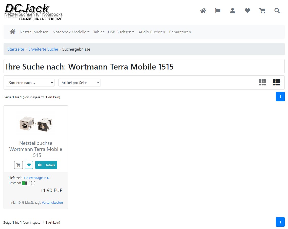 Mögliche Ersatzteil-Quellen sind beispielsweise ipc-computer oder CLEVO Computer sowie bei eBay findet man ebenfalls oft was passendes. Für das vorliegende Gerät lieferte letztlich DCJack den richtigen Treffer. Bei diesem Online-Shop fand sich sowohl unter der Wortmann- als auch unter der CLEVO-Bezeichnung die richtige Buchse: