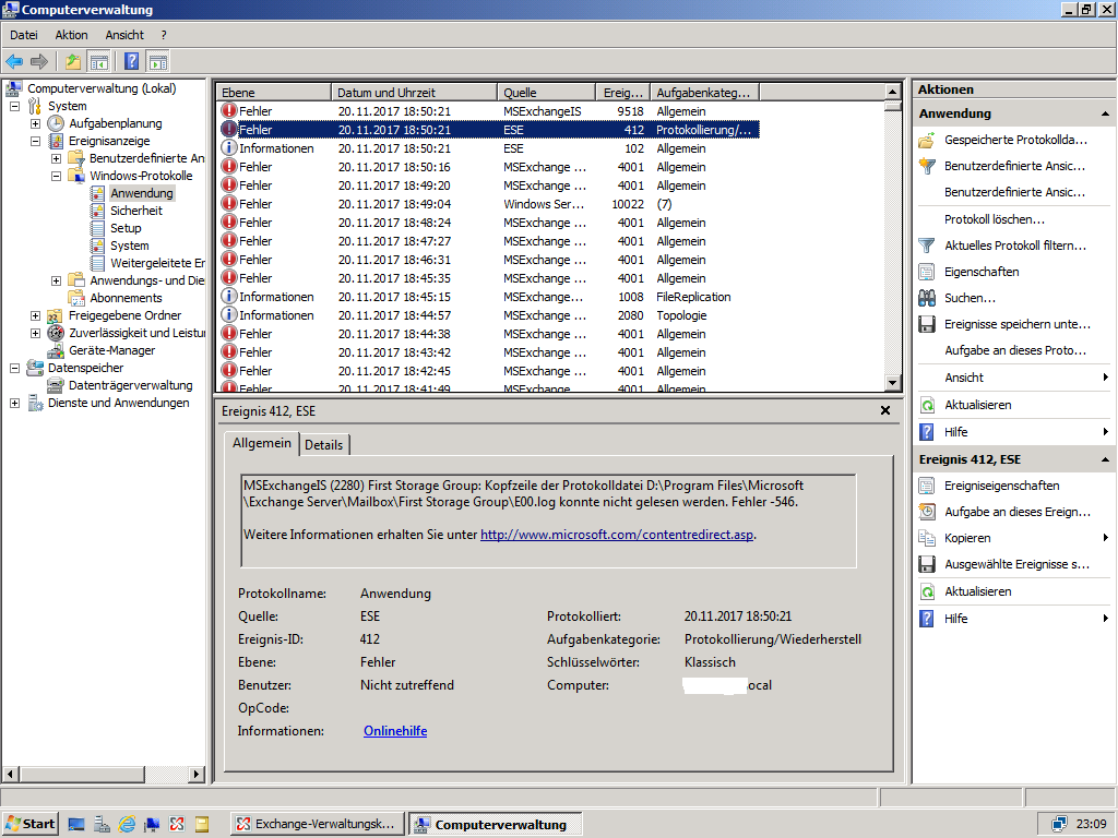 Diesen Plan wollten wir auch für einen abzulösenden Small Business Server 2008 verfolgen. Nach dem Restore als virtuelle Maschine auf einem Hyper-V Server 2012 R2 war zunächst die Überraschung groß, das der Exchange Server 2007 nicht rund lief. Genauer ausgedrückt wurden die Datenbanken nicht bereitgestellt. Im Ereignisprotokoll fanden sich Meldungen wie z.B. diese:
