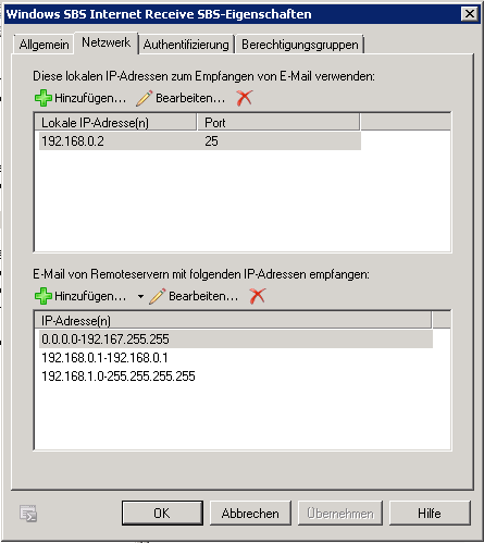 Bei diesem Connector kann man erkennen, das E-Mails von allen Netzen, außer dem lokalen (Ausnahme der Router) angenommen werden.