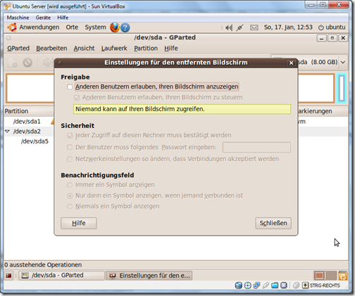Die letzte Zeit habe ich immer mal wieder statt Clonezilla oder der GParted Live CD die Ubuntu DVD zum klonen von Festplatten genommen. Jetzt fragt sich bestimmt, der eine oder andere, warum eine “fette” Distribution nehmen?! Das kann ich relativ einfach beantworten. Zum einen sind mehr Treiber von Haus aus dabei und zum anderen finde ich es unpraktisch, den Kopiervorgang zu starten und dann immer wieder zum Rechner laufen zu müssen, um danach zu sehen, ob er denn fertig ist. Bei Ubuntu kann man mit der Funktion “Entfernter Bildschirm” einen VNC-Server starten und dann von einem anderen PC aus mittels VNC-Viewer auf den Desktop zugreifen. Ich habe das anbei mal mit ein paar Screenshots dokumentiert.