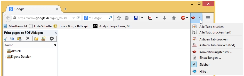 Dazu gibt es noch eine Seitenleiste (Sidebar) und einen eigenen Menüpunkt, denn man über “Anpassen” an eine gewünschte Stelle platzieren kann. Letzteres bietet die Möglichkeit, z.B. alle Tabs als PDF drucken zu können.