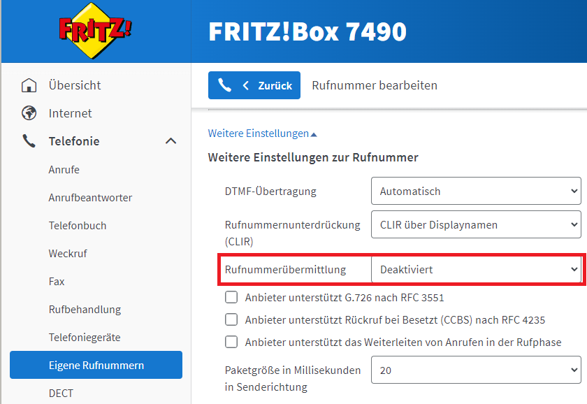 Unter “Telefonie – Eigene Rufnummern” in den erweiterten Einstellungen eines SIP-Trunks findet sich die Einstellungen “Rufnummernübermittlung” die gemäß den Angaben des Anbieters/Tarif konfiguriert werden muss: