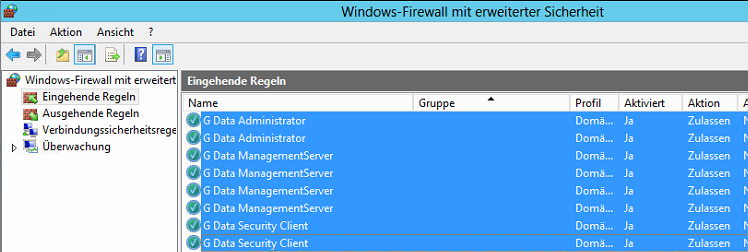 Bislang (meiner Erfahrung nach) wurden die Regeln automatisch bei der Installation des G Data Management Servers erstellt. Da es in der Vergangenheit bei diesem Kunden auch funktionierte, muss etwas anderes geschehen sein, das die Regeln verloren gingen.