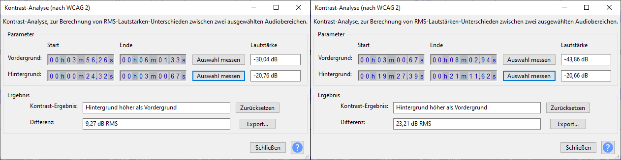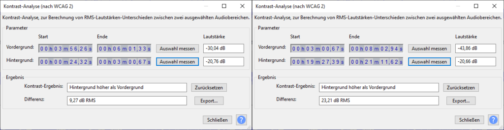 In Audacity geht dies am einfachsten, in dem man zunächst eine Stelle markiert und dann unter “Analyse – Kontrast” anklickt. Nun lässt man zuerst den Vordergrund analysieren, anschließend markiert man eine andere Stelle und lässt den Hintergrund analysieren. So lässt sich anhand der zu bearbeitenden Tonspur als auch an einer Vergleichsspur feststellen, wo groß die Differenz ist bzw. sein soll: